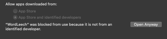 To allow the program to run, go to System Preferemces > Security & Privacy > General and click Open Anyway. You will only need to do this once.