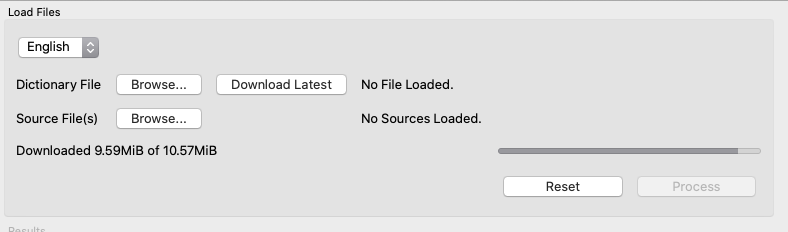 Once both the dictionary and source files have been loaded, click Process and let the utility do its thing. Depending on the size of your source files, this could take a while.