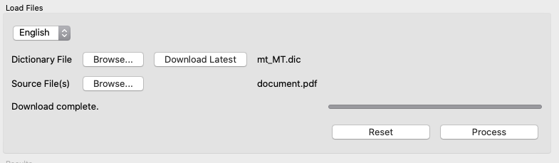 The first thing you'll need to do is to load a current version of the Maltese spelling dictionary. You can click Browse... to find a version on your computer, or Download Latest to download the latest version of the dictionary. If you intend to submit your contributions, please make sure you download the latest dictionary first, to avoid duplication.